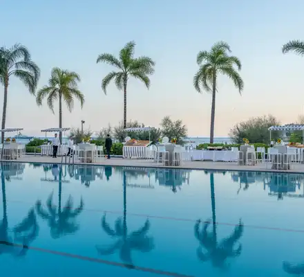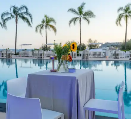 Leave an impression on hearts and minds by privately hiring the Art Deco Le Deck reception room for your wedding, engagement, birthday or any other private event. Its vast terrace under the palm trees, running around the legendary Olympic swimming pool, offers a superb view over the Bay of Monaco.